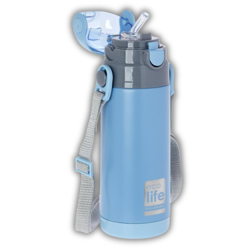 Ανοξείδωτο Παγούρι Θερμός με Εσωτερικό Καλαμάκι και Ιμάντα Μεταφοράς 400ml Blue - Ecolife