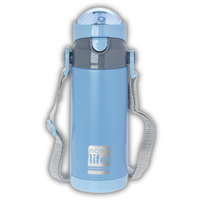 Ανοξείδωτο Παγούρι Θερμός με Εσωτερικό Καλαμάκι και Ιμάντα Μεταφοράς 400ml Blue - Ecolife